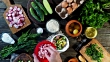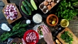 Preparing okroshka, Russian traditional cold soup with kvass. Putting chopped ingredients into the bowl. Overhead view