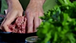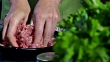 Human hands are preparing stuffed pepper with minced meat and rice. Mixing the styffing
