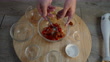 Preparation step tomato topping. Plaice with tomato topping, an oven dish recipe. Using immersion blender to mix tomato pieces in tomato juice, olive oil, balsamic vinegar, white wine vinegar and dried cilantro . Tomato chops chopped onion and minced garlic in field of view. Wooden Lazy Susan. High point of view.