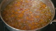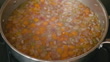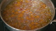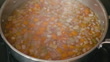 A detailed close-up of the process of preparing vegan minestrone soup in a home kitchen