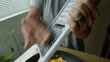 Middle age healthy eating. A pregnant woman in her kitchen grates a black truffle on an omelette, hands close-up.