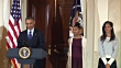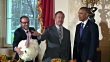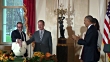 WASHINGTON, DC - NOVEMBER 26: US President Barack Obama (L) and his daughters Sasha (C) and Malia (R) attend the annual National Thanksgiving Turkey pardon ceremony in the Grand Foyer of the White House in Washington DC, USA, on November 26, 2014. Obama celebrated the 67th anniversary of the National Thanksgiving Turkey presentation by pardoning two 20-week old, 48-pound turkeys. (Footage by Michael Hernandez/Anadolu Agency/Getty Images)