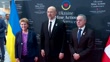 LAUSANNE, SWITZERLAND - OCTOBER 17: (L-R) Prime Minister of Ukraine Denys Shmyhal, President of the Swiss Confederation Viola Amherd and Federal Councillor and Head of the Swiss Federal Department of Foreign Affairs Ignazio Cassis pose for a photo during the Second Ukraine Mine Action Conference on October 17, 2024 in Lausanne, Switzerland. With Ukraine being one of the most mined countries in the world, innovations, such as robots, drones and artificial intelligence, are making it possible to speed up the demining process. Such was discussed during the Second Ukraine Mine Action Conference. This year, it was attended by representatives of more than 50 countries. (Footage by SLM News/Global Images Ukraine via Getty Images)