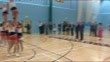 Prince Edward opens Leicester leisure centre; Edward chatting to performers / Edward entering leisure centre buildingINT**BEWARE FLASH PHOTOGRAPHY**People on balcony waving flags / Edward along and chatting to man and starting swimming race / Edward chatting as race going on / Edward along into sports hall and watching netball match / Edward chatting to netball players / Edward along and chatting to badminton players / Edward along and watching cheerleaders / Edward chatting to cheerleaders / Edward along in gym and chatting to staff / Edward watching people on climbing wall / Edward along Edward speech as opening curtains to unveil plaque SOTCheerleaders cheering / Edward along as appaluse / plaque ' De Montford University The Queen Elizabeth II Diamond Jubilee Leisure Centre opend by HRH The Earl of Wessex KG GCVO'