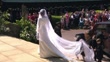 Prince Harry and Meghan Markle wedding day: British artistic director of Givenchy designs bridal dress; ENGLAND: Berkshire: Windsor: Windsor Castle:EXT***MUSIC HEARD SOT***Meghan, Duchess of Sussex (Formerly Meghan Markle) wearing Givenchy wedding dress designed by Clare Waight Keller) out of Rolls Royce car and up steps Meghan up steps as face covered by bridal veilMeghan stopping at top of stepsMeghan stood as wavingWide shot Meghan up steps as Brian and John Mulroney (Page boys) holding trainBack view Brian Mulroney holding dressThe Long Walk:Rolls Royce (Carring Meghan) along the Long Walk past crowds and Bruce Oldfield (Bridal wear designer) speaking SOT