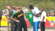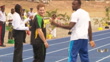 Prince Harry meets Usain Bolt during Caribbean Tour; *** WARNING SOME FLASH PHOTOGRAPHY ***Close shot Prince Harry PAN Usain BoltPrince Harry speaking into microphone SOT- this is a very small country, doesn't matter how big you are, just shows if you've got talent then use it, don't go running off to America because you've got a clear talent that your country needs Usain Bolt interview SOT- to meet him and he is so cool, way relaxed .. loosened up and had fun with him Prince Harry in Jamaica tracksuit as presented with 'Harry can Bolt' t-shirt by Usain BoltPrince Harry and Usain Bolt doing 'Lightning bolt' pose together on track