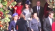Princess Charlotte of Cambridge and other children waving from car / guests congregating outside St George's Chapel / wide shot guests departing / guests departing from chapel entrance / Emma Louise Connolly (Model) and Oliver Proudlock (Made In Chelsea) depart