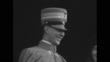 MS Princess Marie Jose wearing head wrap and fur coat / MS Prince Umberto in uniform saluting, person's face smiling comes into view / parade of school children, reviewing stand on one side, spectators in bg / royal couple stands watching, man behind them holding flowers