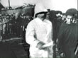 Some shots are reenactments, others are genuine. (Reenactment) TLS escaping convicts running along beach on Devil's Island, sprinting toward camera. (Reenactment) MSTLSs convicts scampering about large dank prison cell, either getting out of beds or leaping into them. Rear view LS escaping convicts running into surf, wading for waiting sailboat. Great panning MS prison guard and inmate entering prison cell afterhours for bed check, inmate holding lantern. VO mentions rash of recent mass escapes from Devil's island. (Reenactment) TLSMS French man apparently an Island escapee meeting mother on otherwise empty street; they embrace, music swells. Excellent panning LS French soldiers carrying rifles with affixed bayonets, marching inmates who carry their meager belongings in sacks to docks. High angle TLSs white male convicts (look at all the fedora hats) shuffling along brick dock, boarding boat. MS crowd on boat (note the black French soldier in FG).