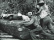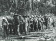 MONTAGE Prisoners marching from boat along dock at Cayenne carrying sacks slung over shoulders, prisoners disembarking boat, marching to barracks, and working in tandem in jungle felling, sawing and moving large logs / Devil's Island, France - stock video