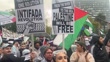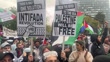 MELBOURNE, AUSTRALIA - MAY 19: Pro-Palestine activists holds placards that read "There is only one solution Intifada Revolution", "From the river to the sea, Palestine will be free" and chant "Free Free Palestine" as they gather near the Victorian Parliament as members of Victoria Police stand guard to avoid clashes with "Never Again Now" participants on May 19, 2024, in Melbourne, Australia. A counter-rally organised by Pro-Palestine activists is taking place near the steps of Parliament as a "Never Again is Now" pro-Israel rally occurs in the same place. (Footage by Diego Fedele/Getty Images)