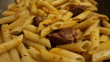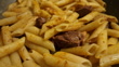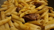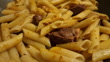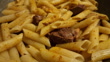 footage emphasizes the texture and color changes in real-time: the glossy, al dente pasta becoming coated with oil and spices, the beef developing a rich, caramelized exterior, and steam rising subtly, indicating the heat of the process. The warm, well-lit setting enhances the mouthwatering appeal of the dish, making it visually captivating. This video would appeal to buyers seeking content for cooking tutorials, food blogs, restaurant promotions, recipe videos, or lifestyle campaigns focused on home cooking or Italian-inspired cuisine