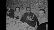 Producer-Director at Paramount Pictures Cecil Blount DeMille, Ceylon Prime Minister John Kotelawala, and Vice President of Paramount Pictures Corporation Y Frank Freeman seated at table, violinist plays behind them / three shot them in receiving line / Walter Pidgeon down the line / William Holden & wife actress Brenda Marshall down the line / Danny Kaye down the line / WS long table with seated guests, violinist plays, waiters serve / Kaye leans over PM and Freeman speaking animatedly / 3 shot Ema Poulson wife of Los Angles mayor Norris Poulson, Major Malcolm Jayasckera aid to PM, and Mrs Larachi, of Larachi Entertainment / CU US Ambassador to Ceylon Philip K Crowe / silent film star Laura La Plante talks with DeMille / WS luncheon table
