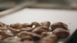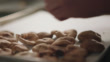 Professional chef puts mushrooms in a line on a baking pan in a commercial kitchen