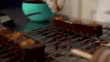 Professional confectioner sprinkle almond leaf on a chocolate cake biscuit on a metal net tray in cake factory