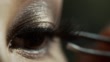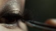 Professional makeup artist apply tweezers glues false eyelashes, close up on eyes fluff up eyelashes and apply tool to touch up eye lashes, Beauty, wedding, Fashion concept. 4k slow motion static