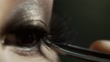 Professional makeup artist apply tweezers glues false eyelashes - 4K stock video