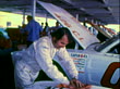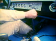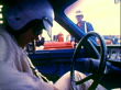 Professional race car driver RICHARD PETTY (King Richard, Richard The King Petty) wearing wide, floppy brim Amishstyle felt hat, black leather jacket, striped polyester pants, long sideburns while chewing gum and walking along rain-slicked concourse, talking with fellow drivers including BUDDY BAKER and pit crew members during rain delay for 1971 National 500 stock car race held at Charlotte Motor Speedway / Richard Petty driving Plymouth Road Runner stock car, shifting gears; Petty wears white helmet and racing suit, dark sunglasses; Petty pulls into pits, removes seat belt, and helmet, climbs out window / stock cars lined up in pit alley on sunny afternoon / men unloading Goodyear tires from trailer, lining them up on ground during rain delay / stock car lined up in pole position / professional race car driver LEE ROY YARBROUGH (LeeRoy Yarbrough) wearing white Goodyear racing suit, wiping down stock car with cloth in covered garages, talking with crew member / Richard Petty Plymouth stock car #43 being pushed by crew members and fellow driver CHARLIE GLOTZBACH, wearing large black cowboy hat. Richard Petty and Lee Roy Yarbrough at National 50 on October 10, 1971 in Concord, North Carolina