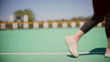 An adaptive softball player gets pushed along the baseline toward home plate while in a wheelchair. The camera rests at a low angle, focused on the wheels and the helper's shoes as they travel forward to score.
