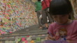 Protesters have drawn, painted and written their reflections of events; Young girl sat on steps writing on post-it 'God bless Hong Kong' Vox Pop (Chinese woman against protest) [Translation voiced over] Various shots satirical images of CY Leung (Hong Kong leader) on posters Revolution poster with Guy Fawkes mask imageVarious shots posters and artwork Riot police through metal barricade Meaghan McGurgaw (Art Critic) interview SOT CUTAWAY person putting post-it note on Lennon Wall Various shots umbrella artwork Various shots people sat on motorway next to or in tents NIGHTVarious shots plants on motorwayVox PopUmbrellas in line on wallVarious shots demonstrators sat sketching Queenie Chan (Hong Kong artist) set up shots sketching / interview SOTWoman putting post-it note on wall Various shots photograph of artist making picture on ground in chalk Posters on bridge wall TILT UP protesters and tents on motorway below