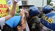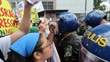 MANILA, PHILIPPINES - MARCH 3: Protestors chant in front of a police line during a protest against the U.S. and Israel's intervention in Iran, outside the U.S. Embassy on March 3, 2026 in Manila, Philippines. Iran's Supreme Leader, Ayatollah Ali Khamenei, was confirmed killed after the United States and Israel launched a joint attack on Iran on February 28. Iran retaliated by firing waves of missiles and drones at Israel, and targeting U.S. allies in the region. (Footage by Ezra Acayan/Getty Images)