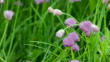 A close up of a purple wild chives wildflower shows it's delicate attraction with water droplets