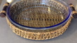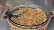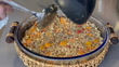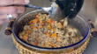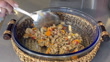 High angle close-up shot of senior woman putting freshly made meat stew inside glass casserole in domestic kitchen