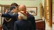 Queen and Prince Philip visit Scottish National Portrait Gallery; SCOTLAND: Edinburgh: Scottish National Portrait Gallery:INTPaintings on wall / Queen Elizabeth II (wearing pale green coat and hat) and Prince Philip, Duke of Edinburgh arriving in art gallery with others / various of Queen and Prince Philip looking at paintings and chatting / Prince Philip pointing to a painting / more of Queen touring gallery / back view of Prince Philip looking at paintings / Queen chatting to Sir Jackie Stewart (Former racing driver) / Prince Philip chatting to Sir Jackie Stewart