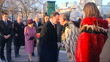 Queen along inside giant rugby ball with John Key to look at projection displays on wall and taking seat followed by Prince Philip