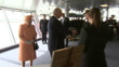 People gathered on balconies in ship's lobby (atrium) / Queen along as people applaud / Queen signing empty picture frame as Philip watching and saying 'It's not a very good likeness' SOT / Queen signing book / Queen along as touring 'Britannia' cruise ship / Philip signing book /