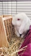 A white female lop-eared rabbit feeding on hay from a hay rack inside a cage.