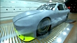 RACE CAR IN WIND TUNNEL: HD: MCU Race car viewed from front left corner in active wind tunnel, white smoke originating from left of camera streaming on left side of car & moving over to right side. NASCAR, Sci-fi, testing, laboratory, aerodynamics.