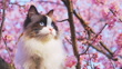 A ragdoll cat in a cherry blossom tree on a pink background