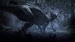 Rain falls on a Parasaurolophus as it forages in a forest.
