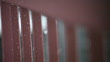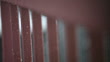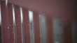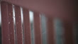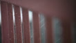 Raindrops fall from the sky and form tiny droplets on a pink railing. Shallow depth of field.