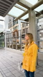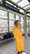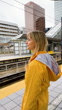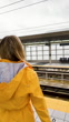 A woman standing with an umbrella at a light rail station in Bellevue Washington. This is a newly opened station which is part of the 2 line. The 2 line will eventually run between Redmond and Seattle.