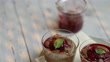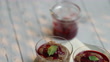 Preparing chocolate mousse with raspberry compote topping. Mint leaf garnish. Wooden plank.