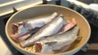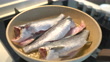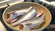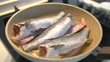 Raw fish being fried in frying pan. - 4K stock video