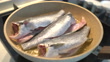 Raw fish being fried in frying pan.Cooking vegetarian meal.