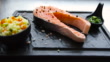 Raw salmon steak isolated on black background with parsley sauce and salad