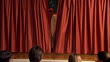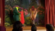 Rear view of audience watching curtains part at beginning of school play / boy in hot dog costume dancing on stage / girls in pea pod and carrot costumes entering and shooing boy off stage / mother rising and taking pictures / girls bowing before audience - HD stock video