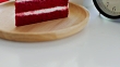 Red cake Strawberries cream cake on wooden dish on white table , dolly shot tilt up