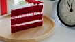 Red cake Strawberries cream cake on wooden dish on white table , dolly shot tilt up - 4K stock video