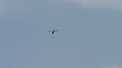 Red dragonfly named Autumn darter or Sympetrum frequens flies in the blue sky