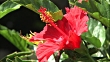 A red hibiscus blossom trembles in the wind. - HD stock video