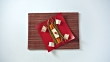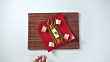 MS HA Red square plate with vegetables and tofu artfully arranged being served onto mat - HD stock video