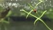 A red water mite (Hydrachna species) in the reeds in a Scottish pond