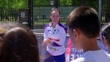 Set-up shots of athlete, Stefanie Reid on running track with schoolchildren