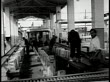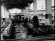MOT 1951: ABADAN KHUZESTAN IRAN: INT Refinery w/ men placing square cans on conveyor belt. Man pushing line of square cans on elevated conveyor rollers. Middle East oil petroleum byproducts gasoline non-sustainable resource Global Warming.