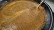 A focus scene on rendang cooking in commercial kitchen in oversized wok